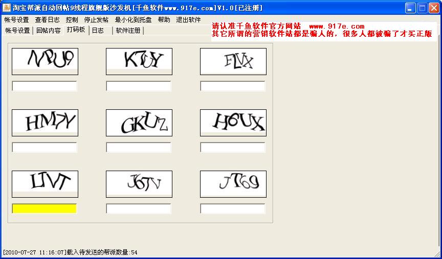 可以在淘宝帮派(淘帮派)论坛按设置的帮派分类、等级、成员数、帖子页数、帖子已回复人数等条件查找最合适的沙发,自动回帖抢沙发,在这些过程中加入你店铺和宝贝的推广信息,将会很快的提升流量和成交量,因为在淘宝帮派上的用户基本上都是淘宝的买家和卖家,目标针对性非常强,都归属直接目标客户,比在其它淘宝以外的社区、论坛发帖、回帖、顶帖更有效果。使用沙发机小号不容易坏,一般抢2-3页,只有10人以内回复的帖子效果最理想。注意:要用小号发帖,可以批量导入小号发,小号如果被限制后软件会自动切换到下一个小号,发帖号有可能被限制登录;经过实名认证的小号发帖可能不用验证码,是全自动发的(当然发一阵后就可能要验证码了),低等级的小号发帖要验证码,软件会自动识别是否需要输入验证码,并将验证码显示在打码版上,要手工输入验证码,本软件使用的是同时9个线程同时工作,有一个打码版可以打好一个验证码自动跳到下一个,网速不是非常慢的话保证你一直有码还没打,速度超快。