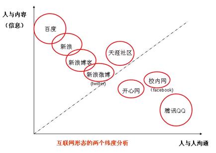 百度(搜索、贴吧、空间)、新浪(新闻、博客、微博)、天涯(社区向SNS)依托内容(信息)平台,往人的平台做延伸。而腾讯(QQ、门户)等则是依托人的平台,往内容平台做延伸。国外twiiter实际上通过和google的合作,也向内容延伸。新浪最近战略投资开心网,则反映了内容和社区的未来融合的趋势。
