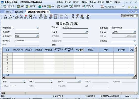 通过主界面→销售管理→销售发票,打开销售发票编辑界面,在这里主要用于制作新的销售发票,如果要对单据进行修改、审核、关闭或下查等操作,可通过销售发票序时簿进行操作,下一节会做具体讲解,销售发票上包含的业务和管理信息非常多,单据头部分用来描述针对该业务处理过程共性的业务信息,如单据编码、单据日期等;单据体部分用来描述不同物料的基本信息和单据信息,如每条物料数量、每条物料价格等等。